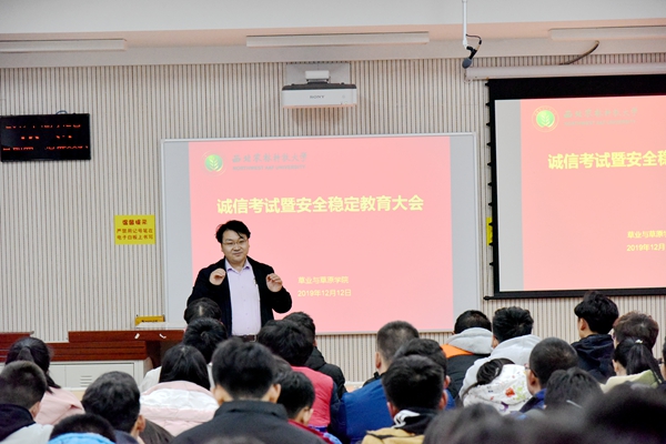 为严肃考风考纪,营造文明、诚信的良好学风氛围;为进一步提高学生安全意识,营造健康向上的校园文化氛围。我院于12月12日下午在8号教学楼召开诚信考试暨安全稳定教育大会。日韩在线 副院长杨培志、辅导员郭燕楠、全体2018、2019级本科生参加会议,会议由辅导员郭燕楠主持。
