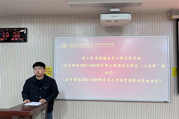 日韩在线 团委副书记王辉老师宣读《关于聘任2023-2024学年第二学期学业帮扶“小老师”的决定》以及《关于聘任2023-2024学年第二学期学风评议员的决定》。